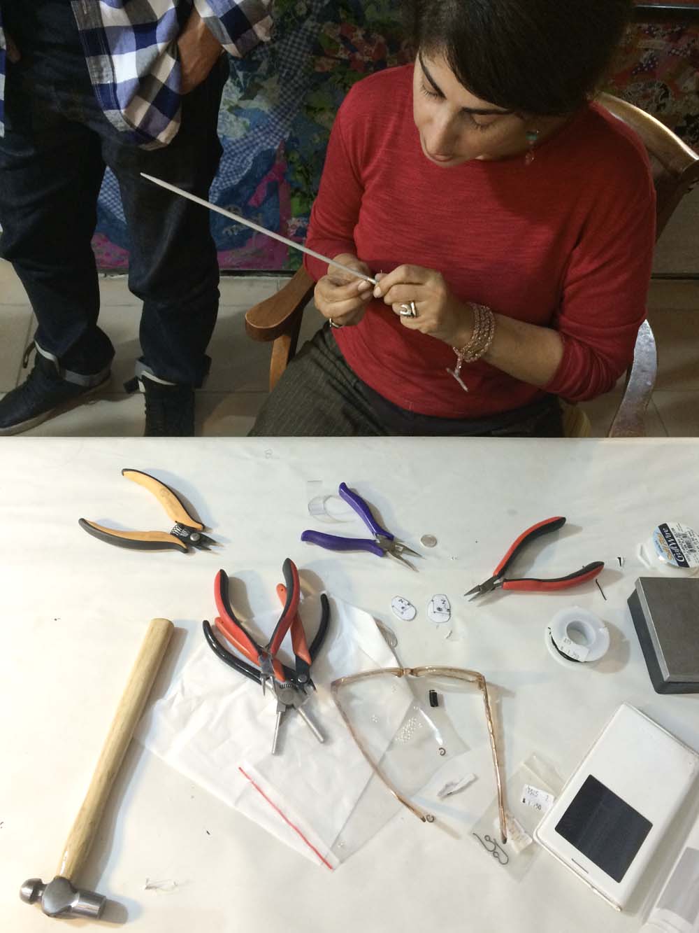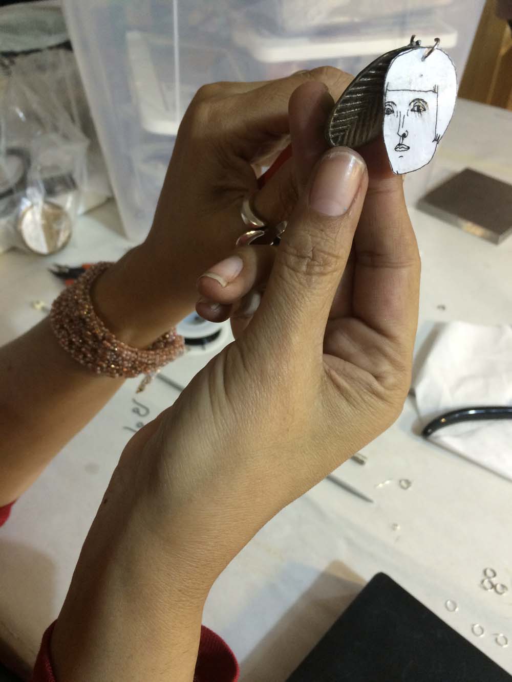 i made the components but lubna generously put everything together. because i made the holes in my pieces so tiny, it was a challenge finding a wire thin enough for the jump rings, so here Lubna is creating custom ones for me. this is what i call love and passion for one's vocation