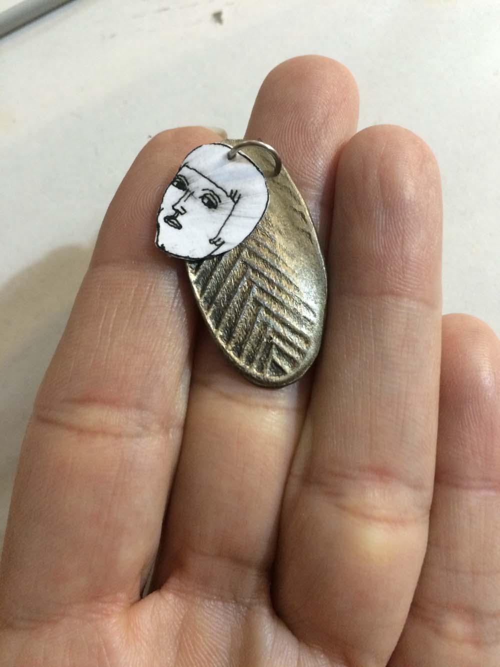 and lastly but not leastly, david finishes his men-dant (that’s a men’s pendant, i just made it up): partial compass on one side and this script on the other