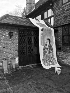 Nice picture. (Looks like France, actually!) I like the texture of the wall, quite similar to the dress of the represented character. And the dog, his head, almost aligned with the two heads in the painting. Is it meant to be site-specific work ?