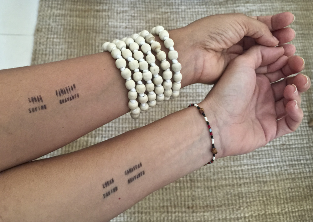 - chris’s stamp says ‘lokah samastah sukino bhavantu (may all beings everywhere be happy and free). and thank you, reem, for this pretty wrist band to ward off the evil eye