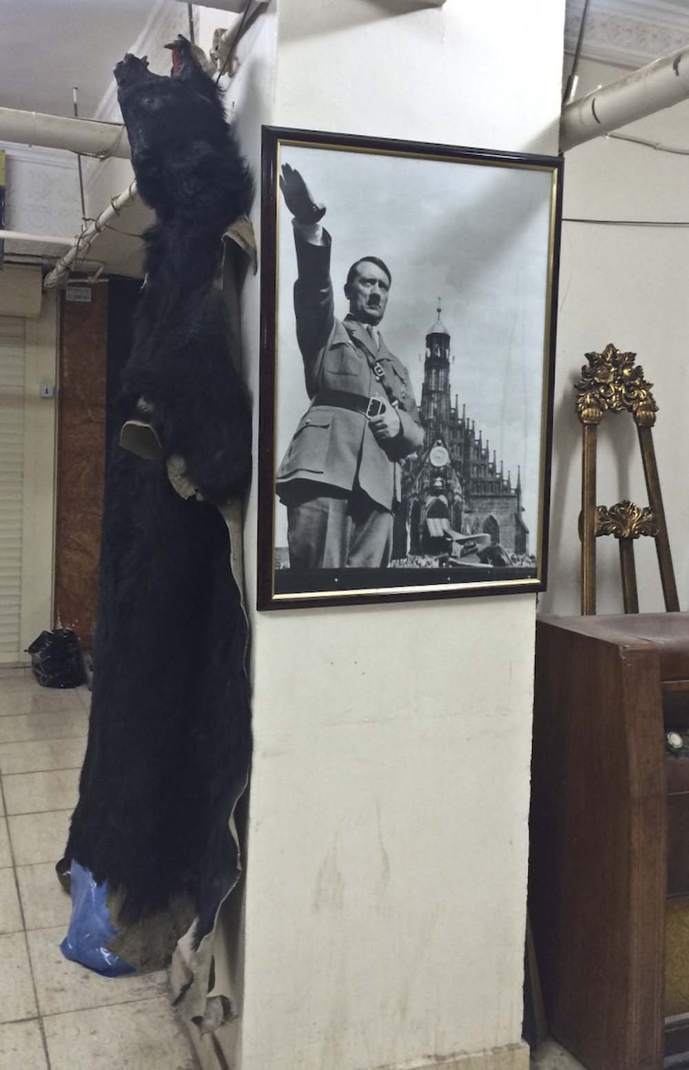 in the basement of ‘wig mall’ z and i were alone in this indoor antique market. dalal actually told us about it when i inquired about the book she gave me. so it wasn’t a total surprise. it was creepy, as you can imagine. and i don’t know what’s more controversial: a hanging bear rug (badly stuffed) or a framed poster of hitler