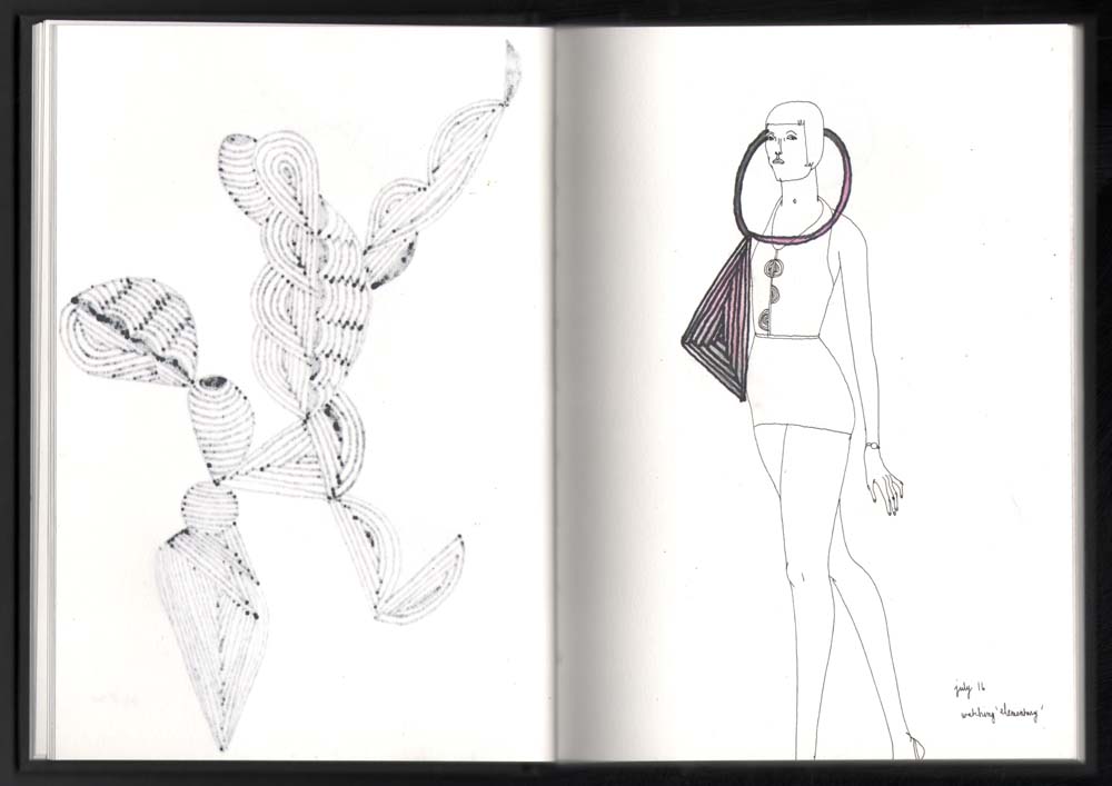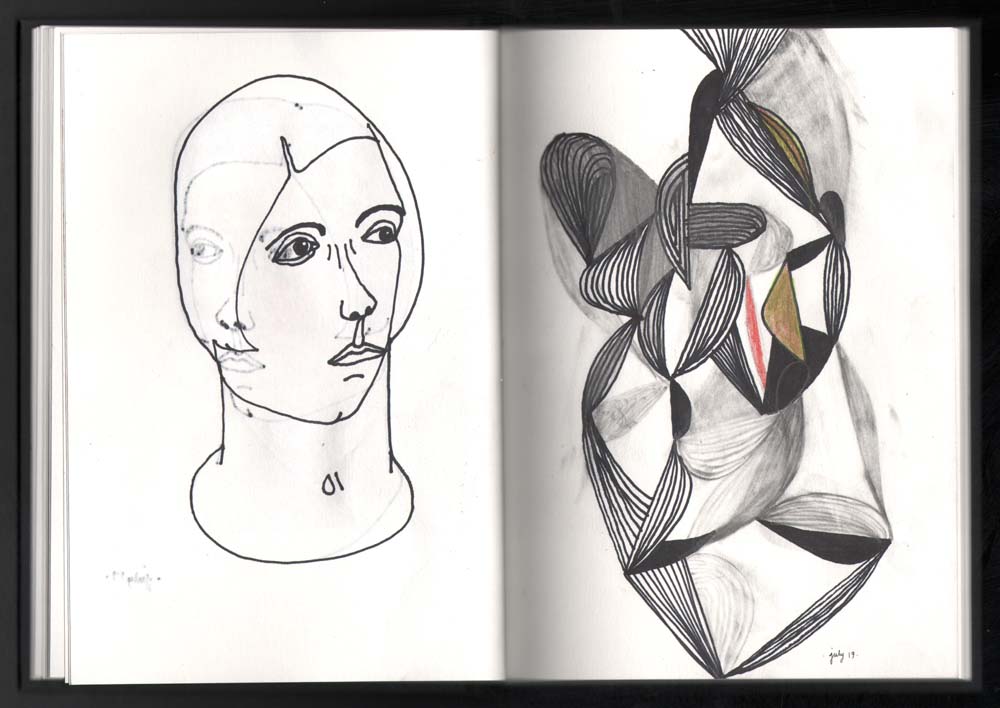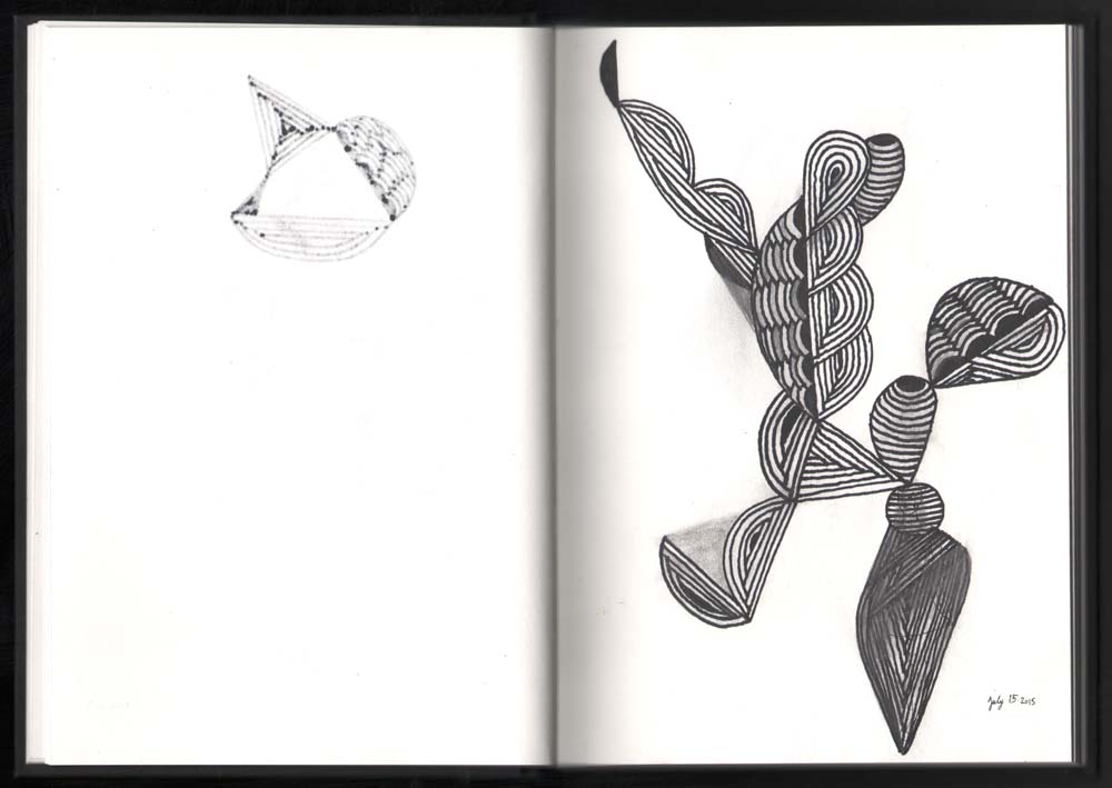 Anyway. I wasn’t planning on documenting the pages in this book because frankly I felt my sketches were boring and somewhat perfunctory. But as I went deeper into it, and discovered how to work with the paper, it started to make more sense to me visually. I realized that this sketchbook should be viewed as an evolutionary progression rather than a series of individual drawings. So here are the first seventeen pages of my new sketchbook.