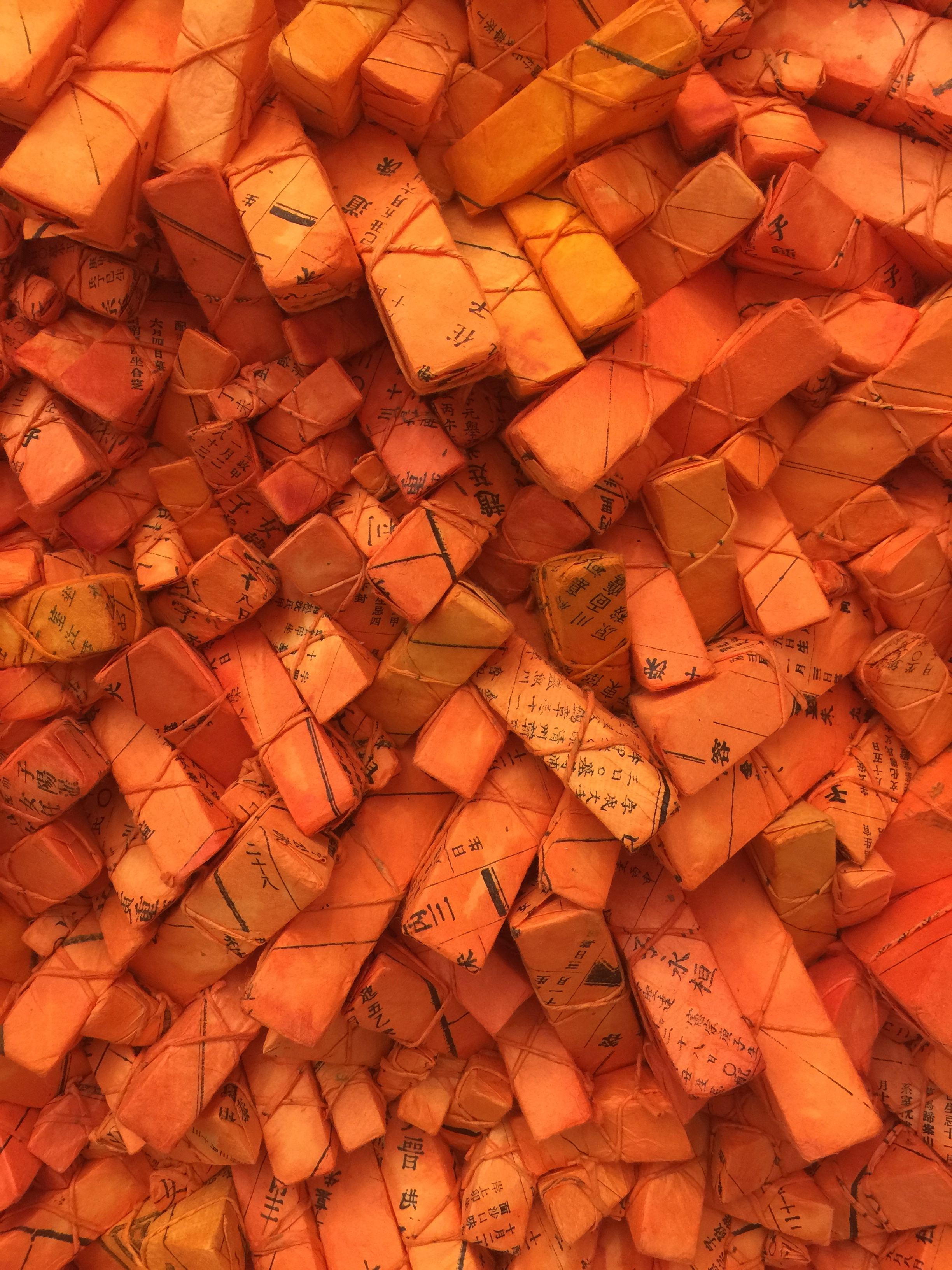 every one of these pieces was individually dyed, wrapped in mulberry paper and tied with string made from the same paper