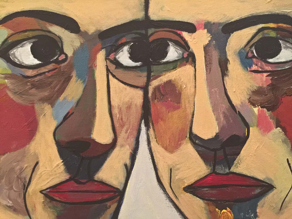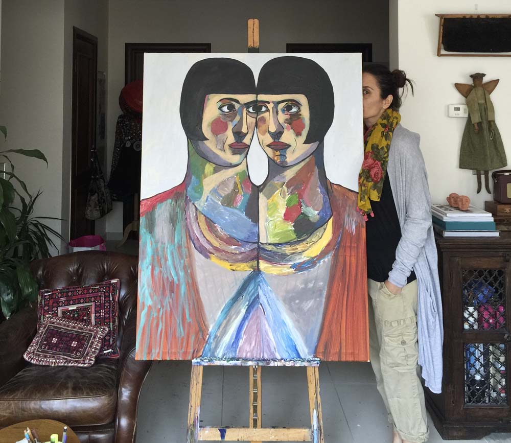 Orange. That’s the first colour I see followed by a deepening blue about the chops of the two lovelies you chose to create. There seems to be a narrative – of longing, secrets maybe or at least intimacies between good friends. I really like your loose treatment of the colours, and the colour choices. Do they choose you or is it vice versa? Maybe a bit of both. Do you perhaps dream them, then feel obliged to employ them?