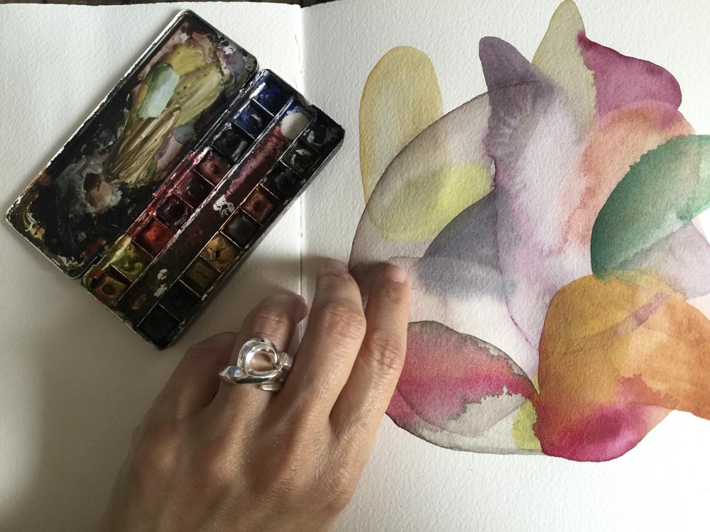 How’s this for a chain reaction: two nights ago I invited some friends over to watch the Iceland vs. France match with me. That night one of those people, my dear friend Lubna, returned my ring after generously getting it all polished and new for me. The next day, yesterday, I felt it imperative that I photograph that ring for Instagram (of course!). But (of course again) I needed a complementary backdrop, so I started a watercolor just for it.