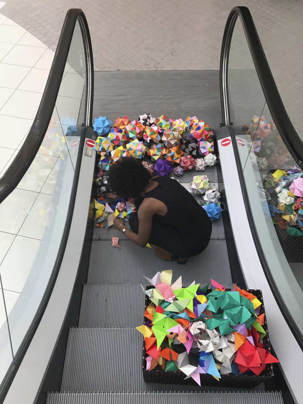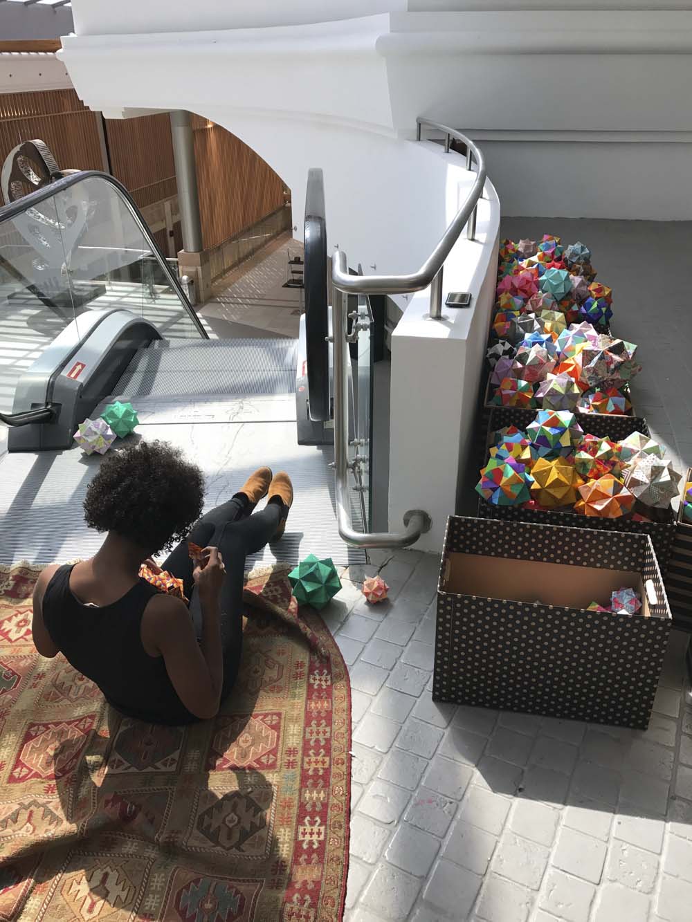 Azza and I had to devise a plan for this operation. We did a few test shots of where she should be situated as not to see her head peeping out. I set up the camera on a makeshift tripod (if you look at the ground level you will see that I have a box atop a step ladder atop a table I grabbed from the cafe below). Azza’s job was to lie flat on her belly and roll the polyhedra down the escalator. I clicked the record button and ran up another escalator on the other side of the cafe, crawled to where she was and plopped on the ground to help her. We rolled polyhedra down the escalator for around seven minutes.