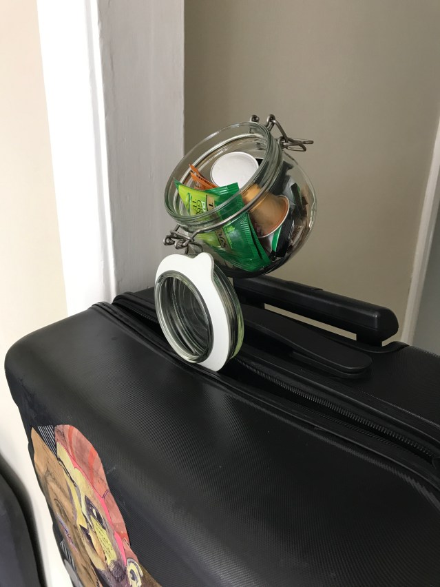The first thing I did yesterday morning was pose with a bowl of fruit and my traveling tap. Managing a self-timed photo from that angle was tricky.