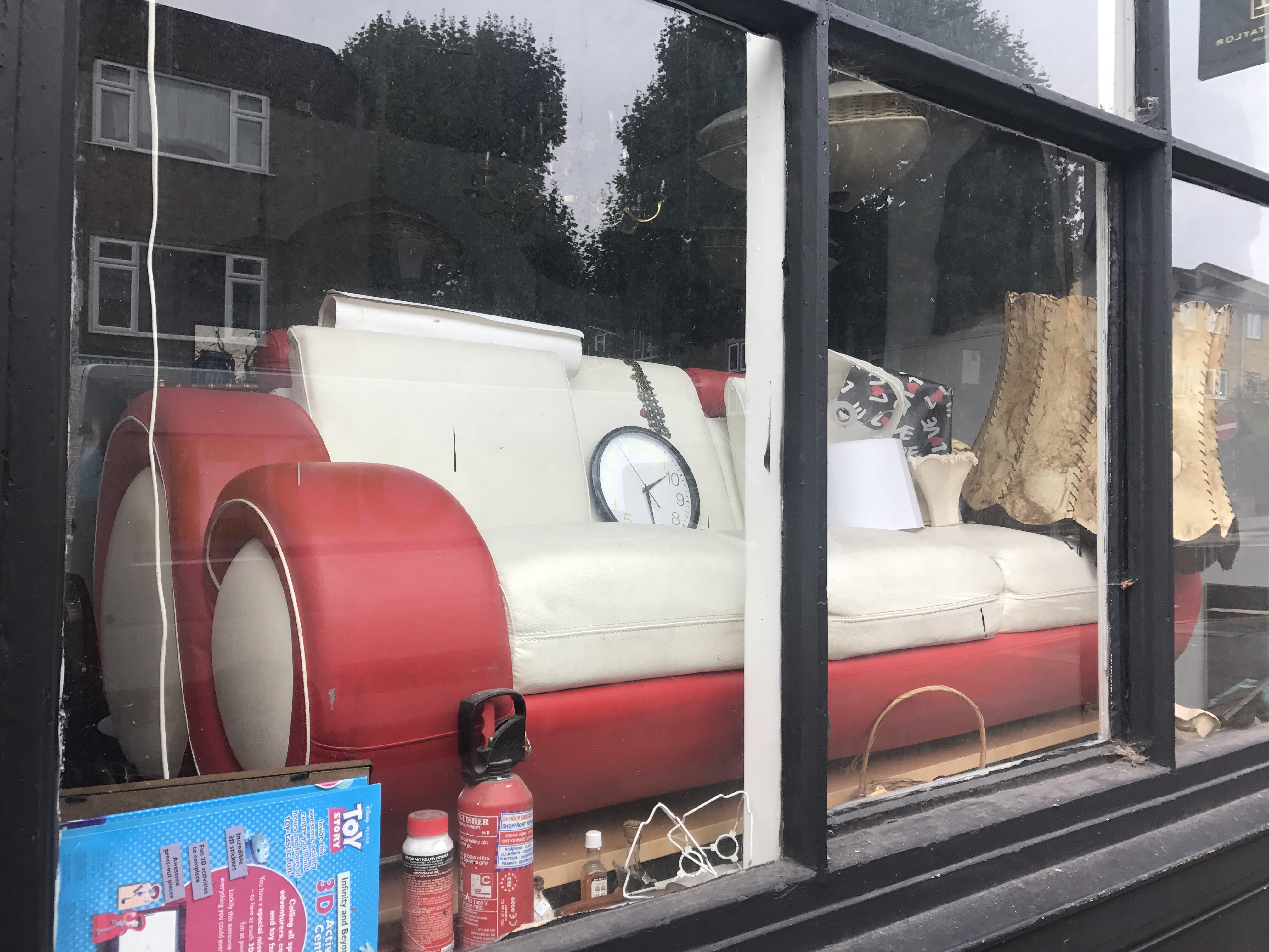 Next day we stay close to home. I see this crazy sofa in a window. I wonder what the clock is thinking.