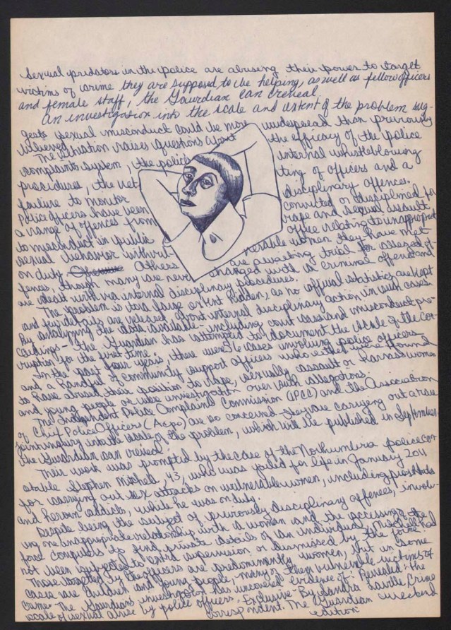 when you get a strong, physical urge to write while completely relaxing your mind, you resort to being dictated to. in this instance by ‘the guardian’ newspaper. i just transfered part of an article using a blue bic pen onto this wonderful newsprint notepad. i regard it as another form of painting from life, but i’m drawing the words for what they are rather than writing them for what they mean. and a big part of the exercise is the fact that the pen writes so nicely on this paper, and the paper reacts so well to the ink, developing a noticeable crinkle by the end.