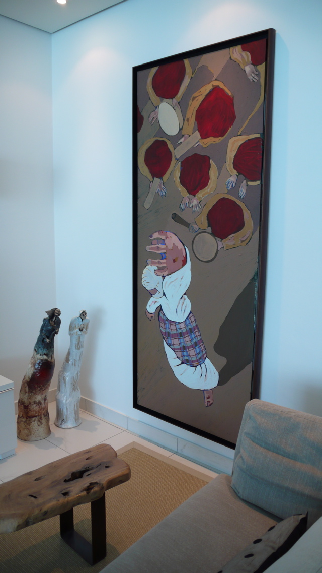 Mai and Adeeb’s painting is accompanied by two sculptures by Abbas Mallek on the left of the photo. Mai wrote to me that it ‘plays the music for Abbas Mallek’s wonderful dancing Kuwaiti man and woman’.