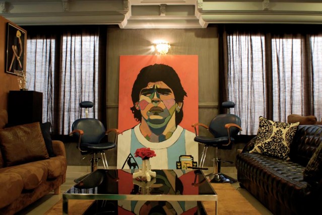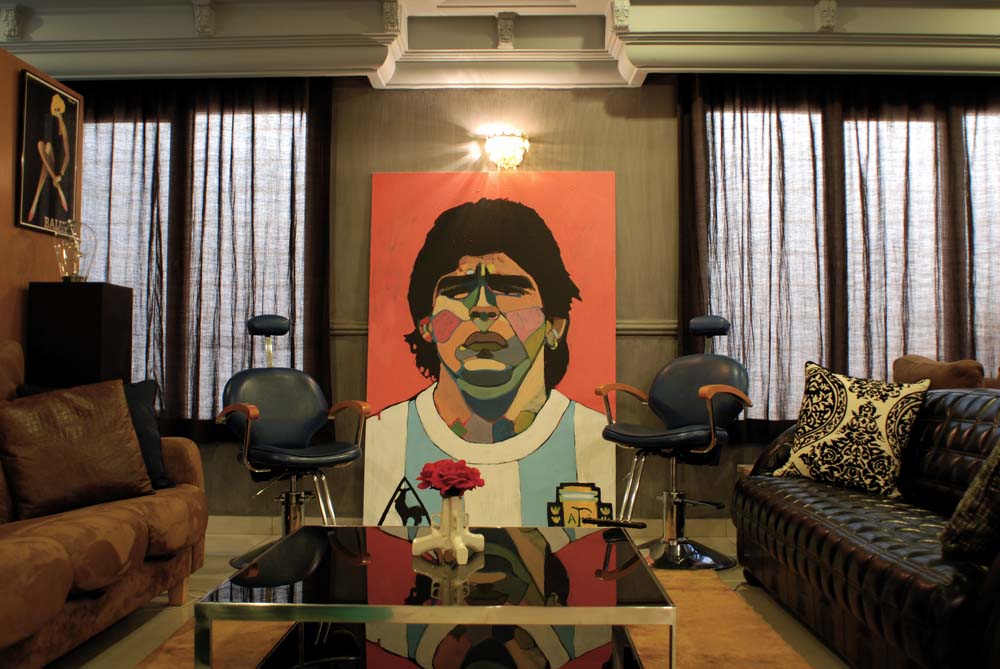 This painting hangs in the dining room of Farah Behbehani’s home. I love the way the carpet echoes the colors of my girl. The painting itself is one of a kind. I had never (and probably never will) painted what I call tantric lines on a canvas before. These lines emanate from another face within the main character. The face is the heart and the lines are the arteries and capillaries which sustain the rest of the body and mind. I was very emotionally distraught when I painted it a few years ago and I think it shows. But somehow, the painting works in a tranquil setting such as this. And I’m very flattered that Farah has one of my works because I am a huge admirer (and possessive owner) of her beautiful calligraphy book, The Conference of the Birds.